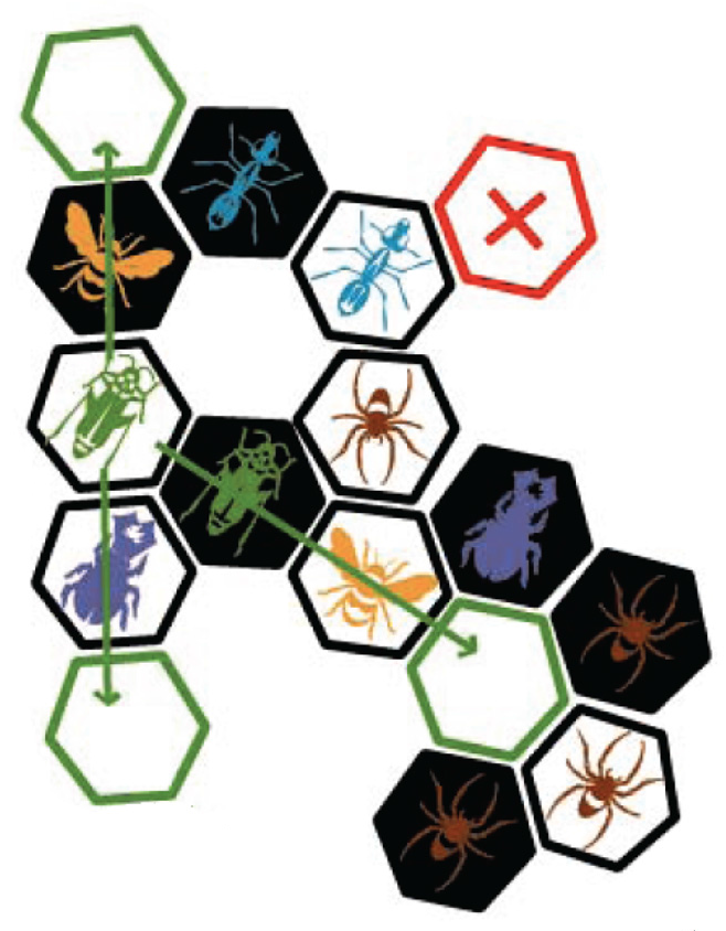 Kudlanka se nehýbe, ale čeká... Kudlanka se nemůže hnout jako ostatní brouci, ale může skočit na poslední soupeřem umístěný dílek jeho barvy a tím tento dílek i sebe permanentně odebrat ze hry. Komár je odebrán pokud napodobuje schopnosti predátorů. Při odstraňování dílků nelze rozpojit úl. Ani jeden z predátorů nemůže odebrat dílek, který se dotýká Ploštice.